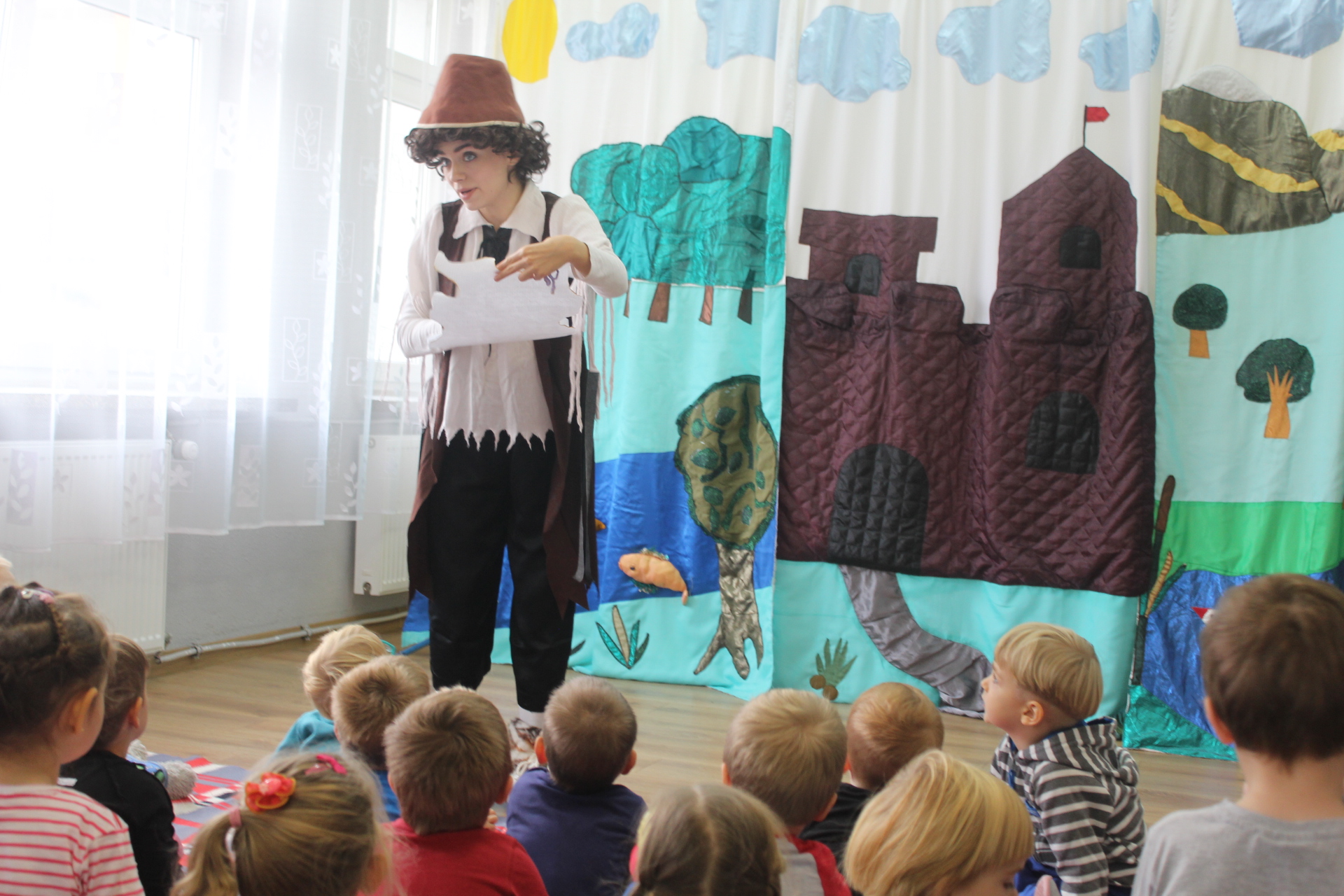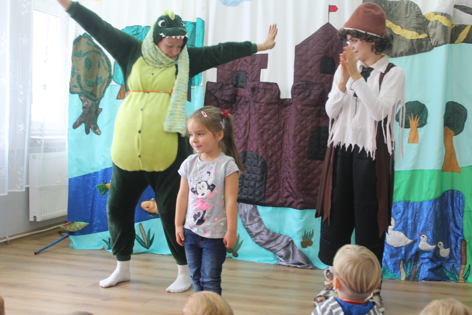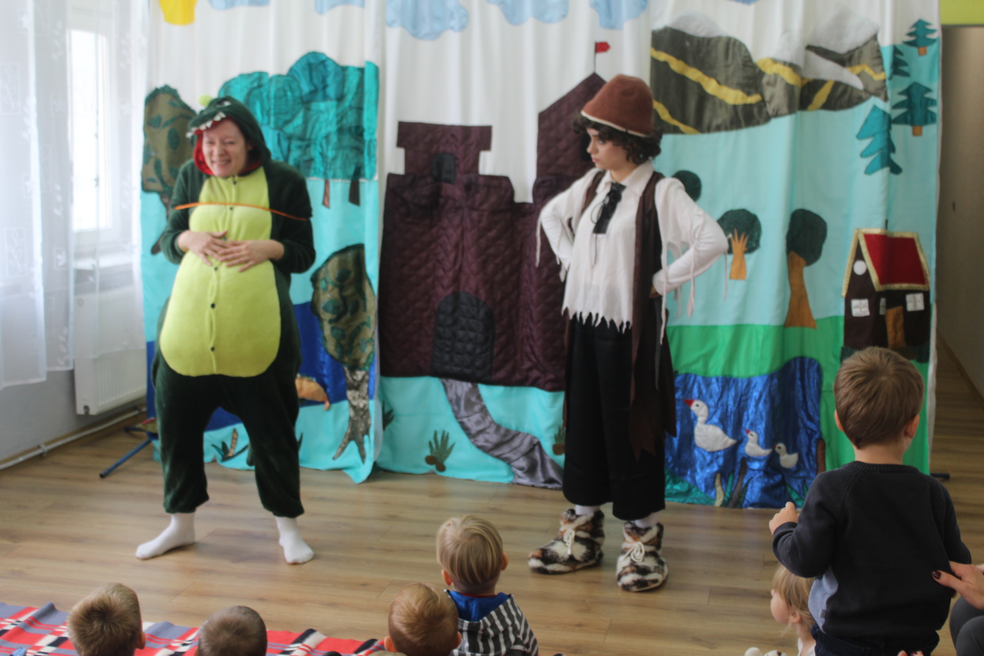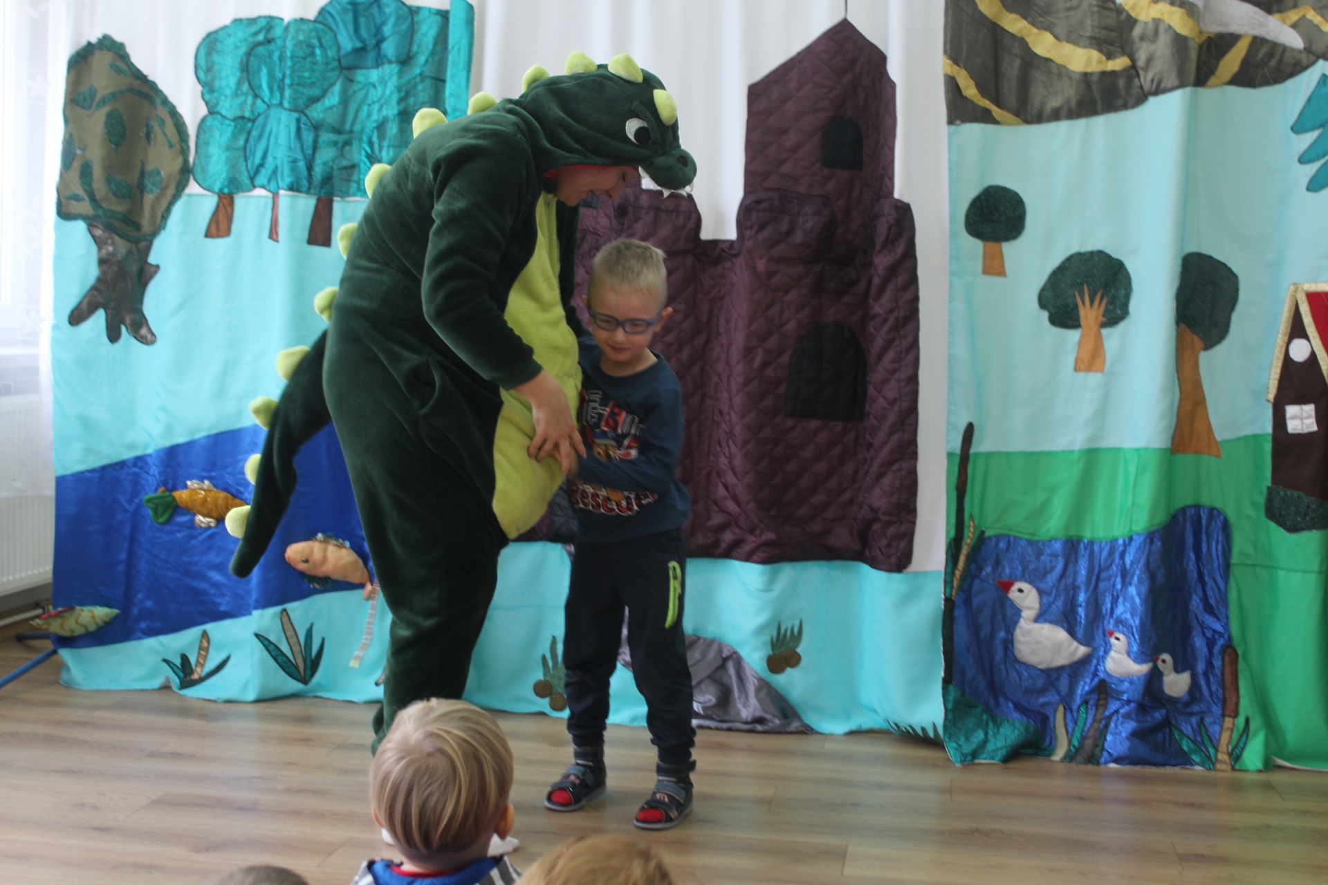 W dniu 28 października 2018 roku nasze przedszkole odwiedzili aktorzy z krakowskiego teatru z inną wersją bajki “Legendy o smoku wawelskim.” Mogliśmy pomagać Szewczykowi, Smokowi i Królewnie a nawet sobie wzajemnie. Przedstawienie bardzo nam się podobało.