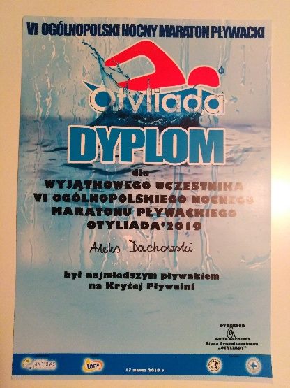 W sobotę tj. 16.03.2019 roku wychowanek naszego przedszkola  Aleks Dachowski wziął udział w VI Ogólnopolskim Nocnym Maratonie Pływackim Otyliada 2019. Aleks był najmłodszym pływakiem na chrzanowskiej krytej pływalni Cabańska Fala. Przepłynął 150 metrów, czyli 6 długości basenu. Z rąk Wicestarosty Chrzanowskiego Pana Bartłomieja Gębali, Wiceburmistrz Chrzanowa Pani Jolanty Zubik oraz Dyrektora Krytej Pływalni Pana Dominika Godynia otrzymał nagrodę w postaci maskotki foczki Otylki, medal i dyplom dla wyjątkowego uczestnika nocnego maratonu.