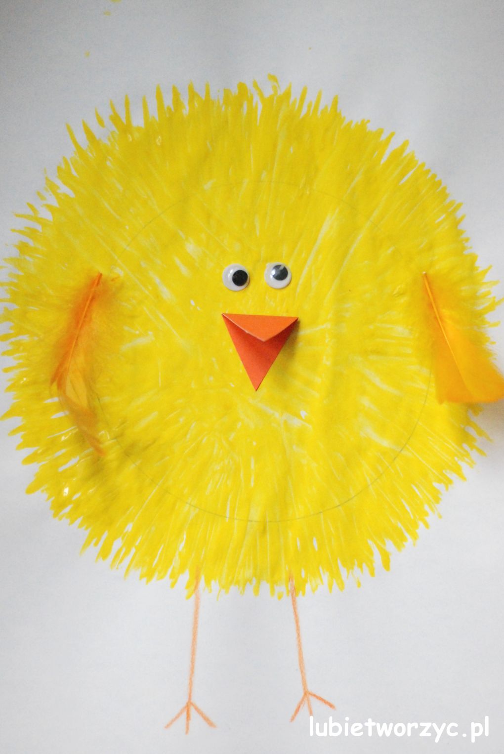 Zadaniem dziecka będzie pokolorowanie na żółty kolor koła narysowanego na kartce. Gdy farba wyschnie poprośmy dziecko o przyklejenie oczek, piórek itp. Ot, i kurczaczek gotowy!