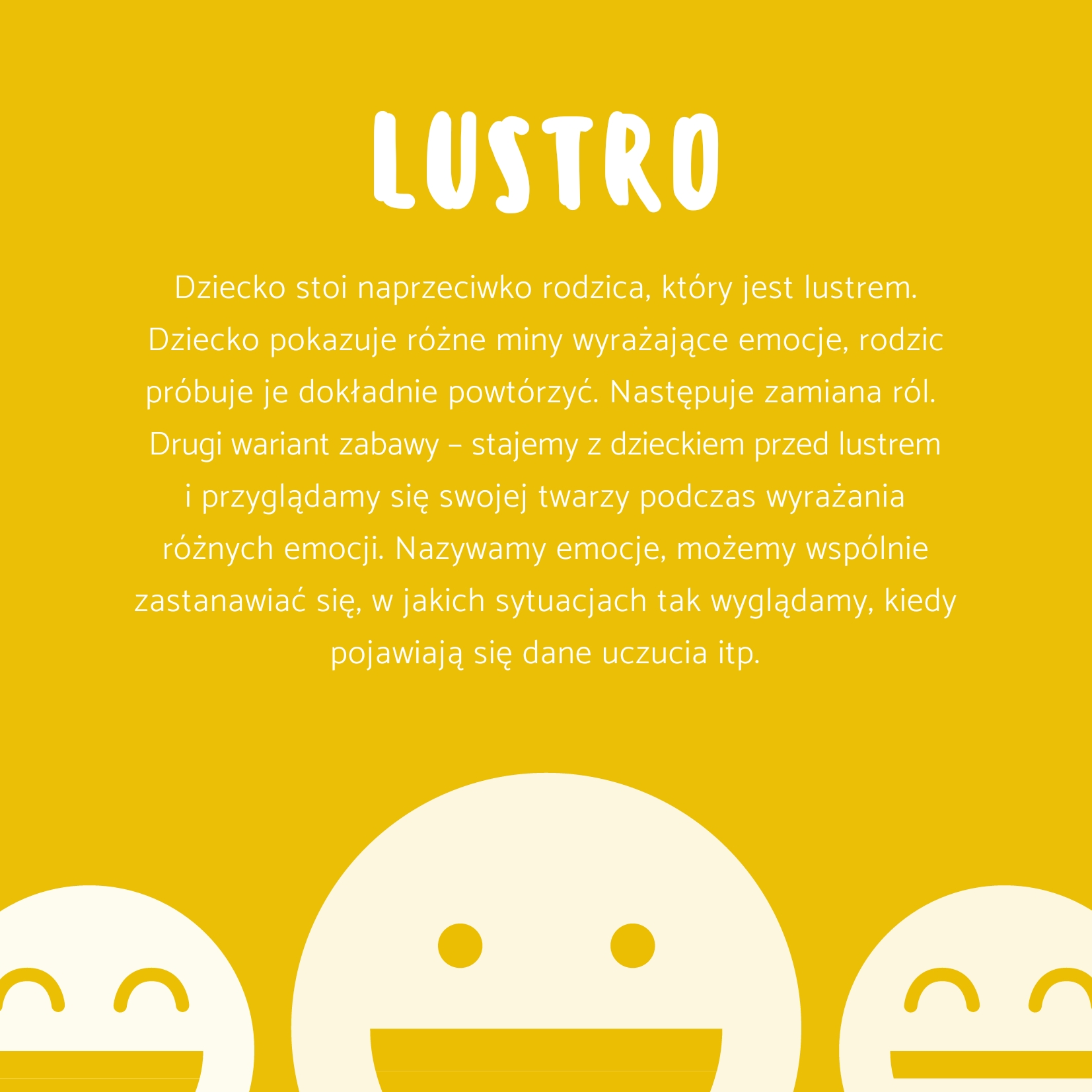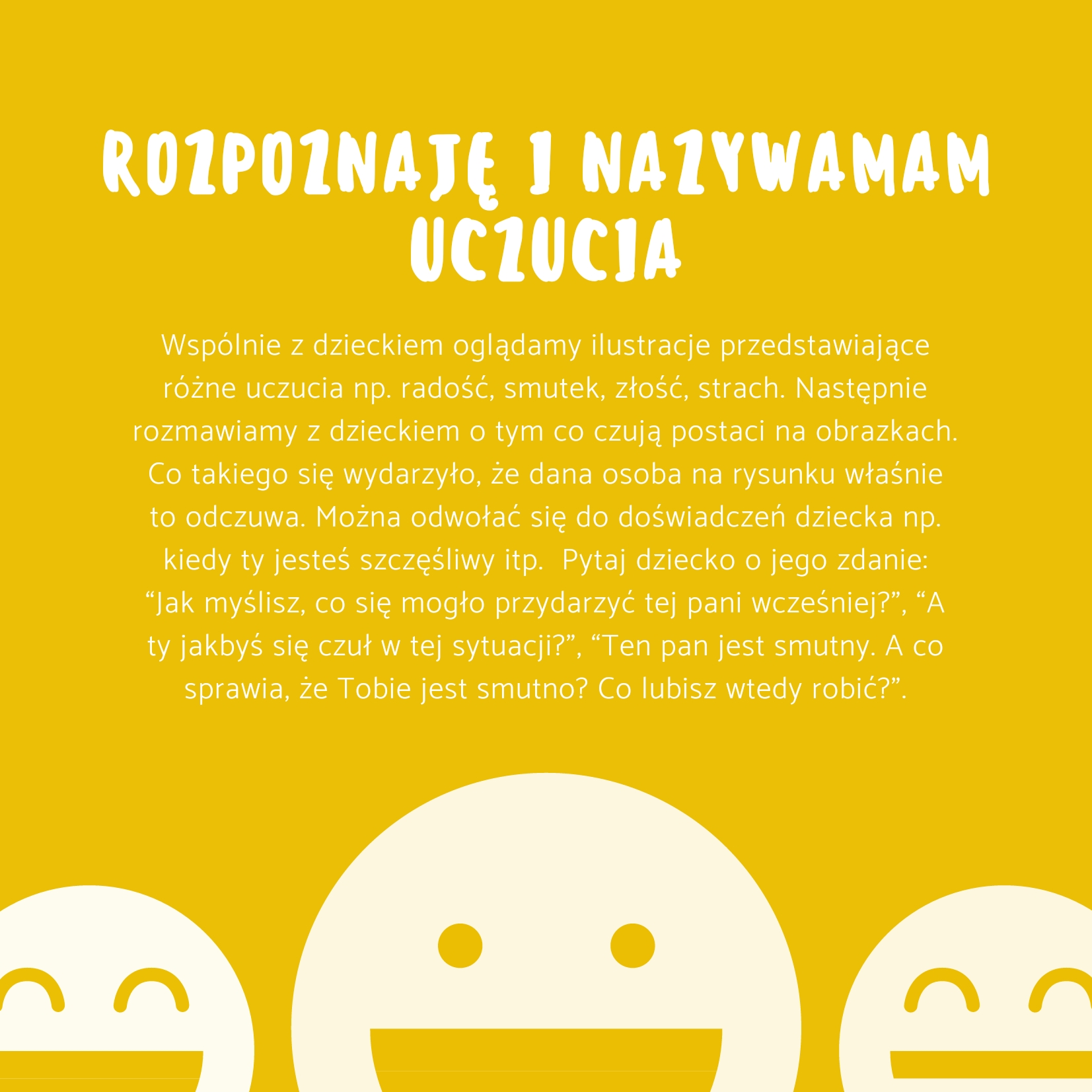 Bawiąc się z dzieckiem możemy wspierać rozwój jego inteligencji emocjonalnej. Podczas codziennych aktywności starajmy się pokazywać dziecku świat emocji poprzez rozpoznawanie i nazywanie stanów emocjonalnych swoich oraz innych osób, rozmawiajmy o potrzebach drugiego człowieka oraz o tym jak radzić sobie w różnych sytuacjach. Pamiętajmy – emocje są naturalne, wszystkie uczucia do czegoś nam służą i nie należy tłumić żadnej z nich. Każda emocje jest nam potrzebna – zarówno emocje przyjemne jak radość, ale i te nieprzyjemne, trudne jak smutek czy złość.