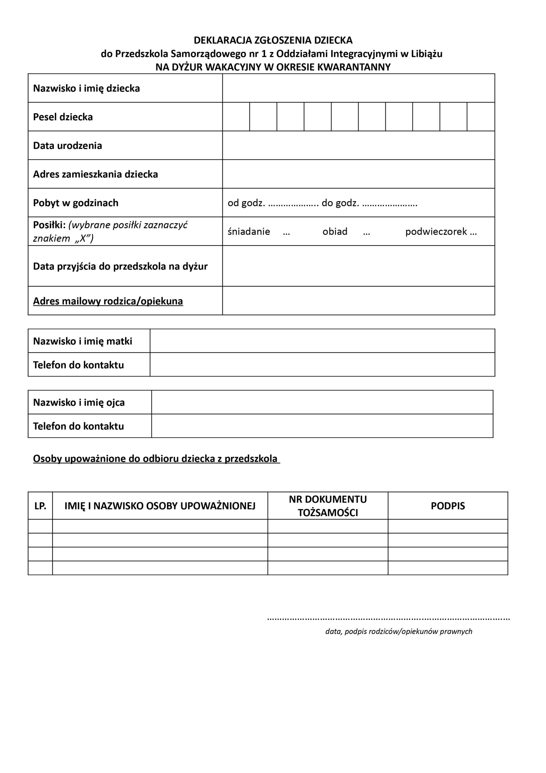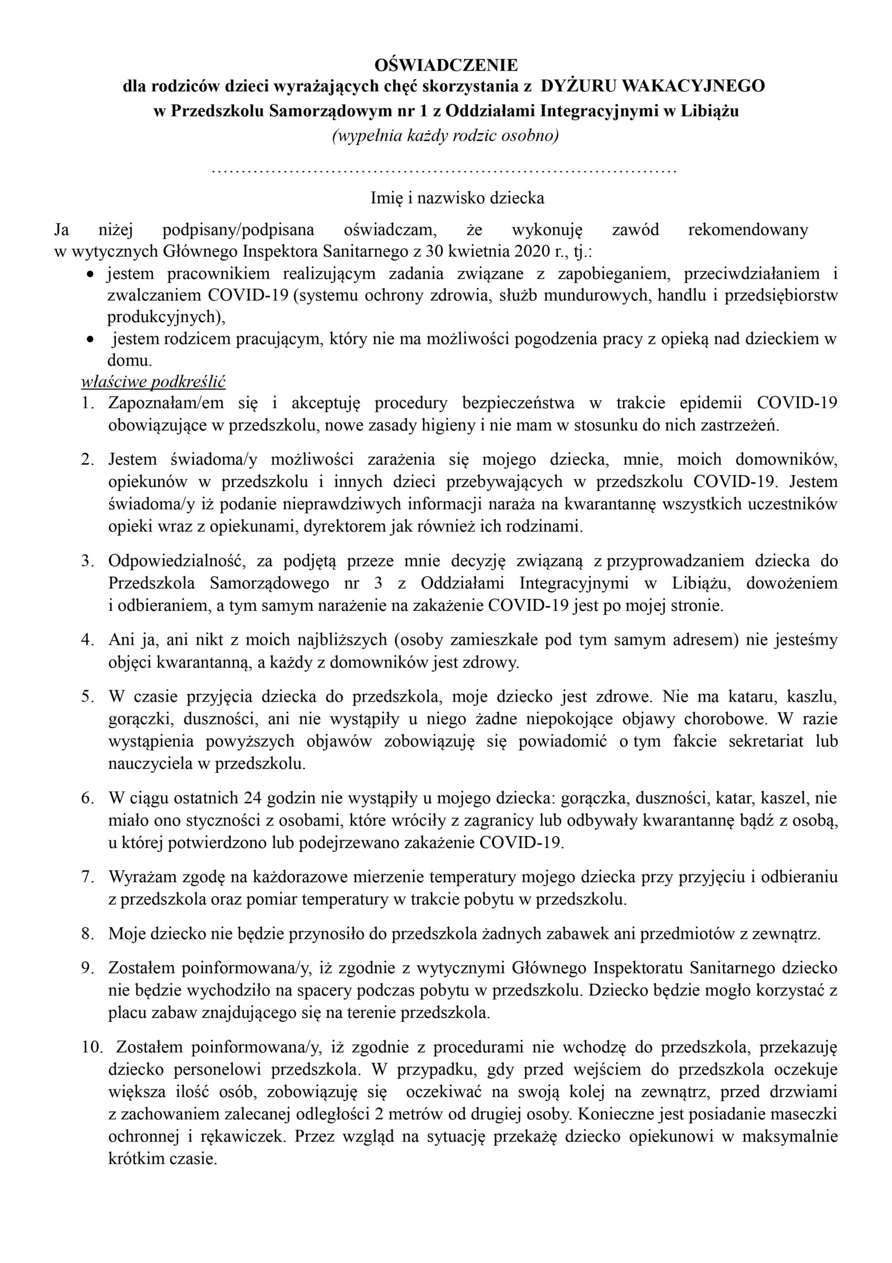 3. Odpowiedzialność, za podjętą przeze mnie decyzję związaną z przyprowadzaniem dziecka do Przedszkola Samorządowego nr 1 z Oddziałami Integracyjnymi w Libiążu, dowożeniem i odbieraniem, a tym samym narażenie na zakażenie COVID-19 jest po mojej stronie.