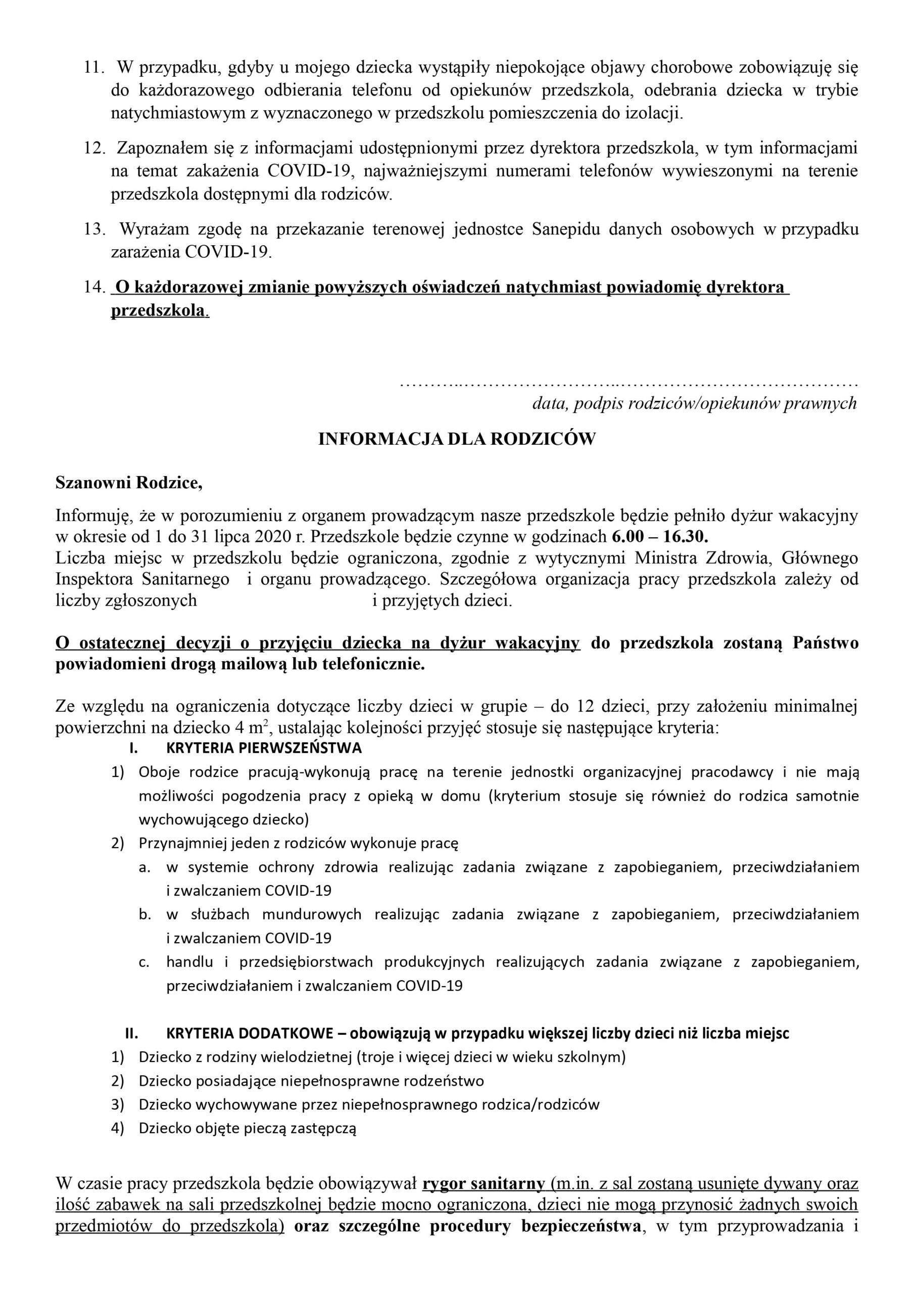dla rodziców dzieci wyrażających chęć skorzystania z DYŻURU WAKACYJNEGO