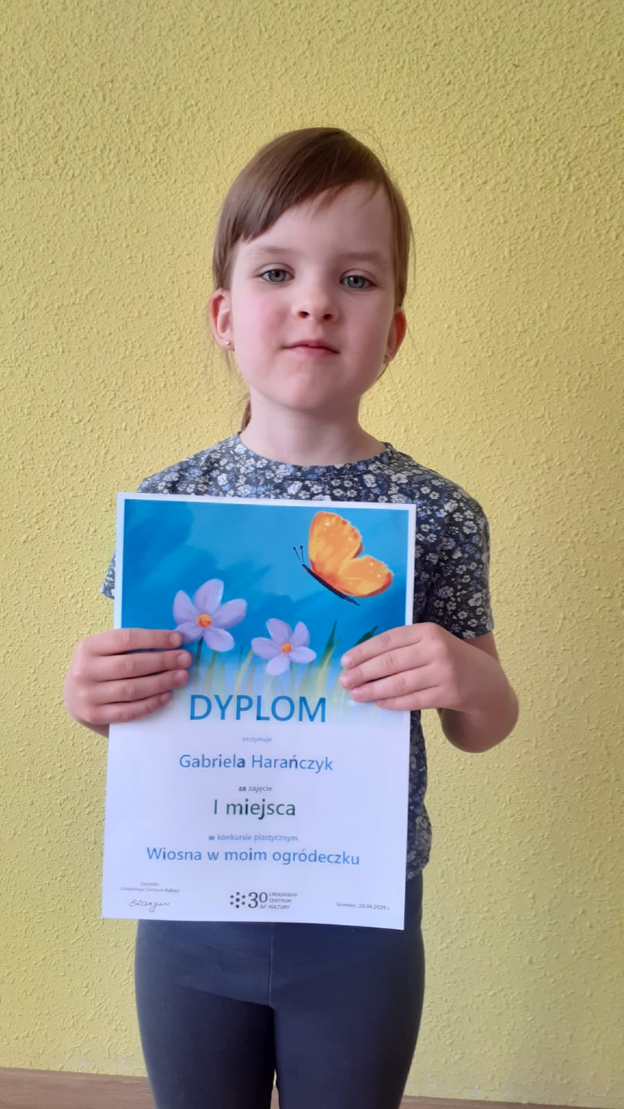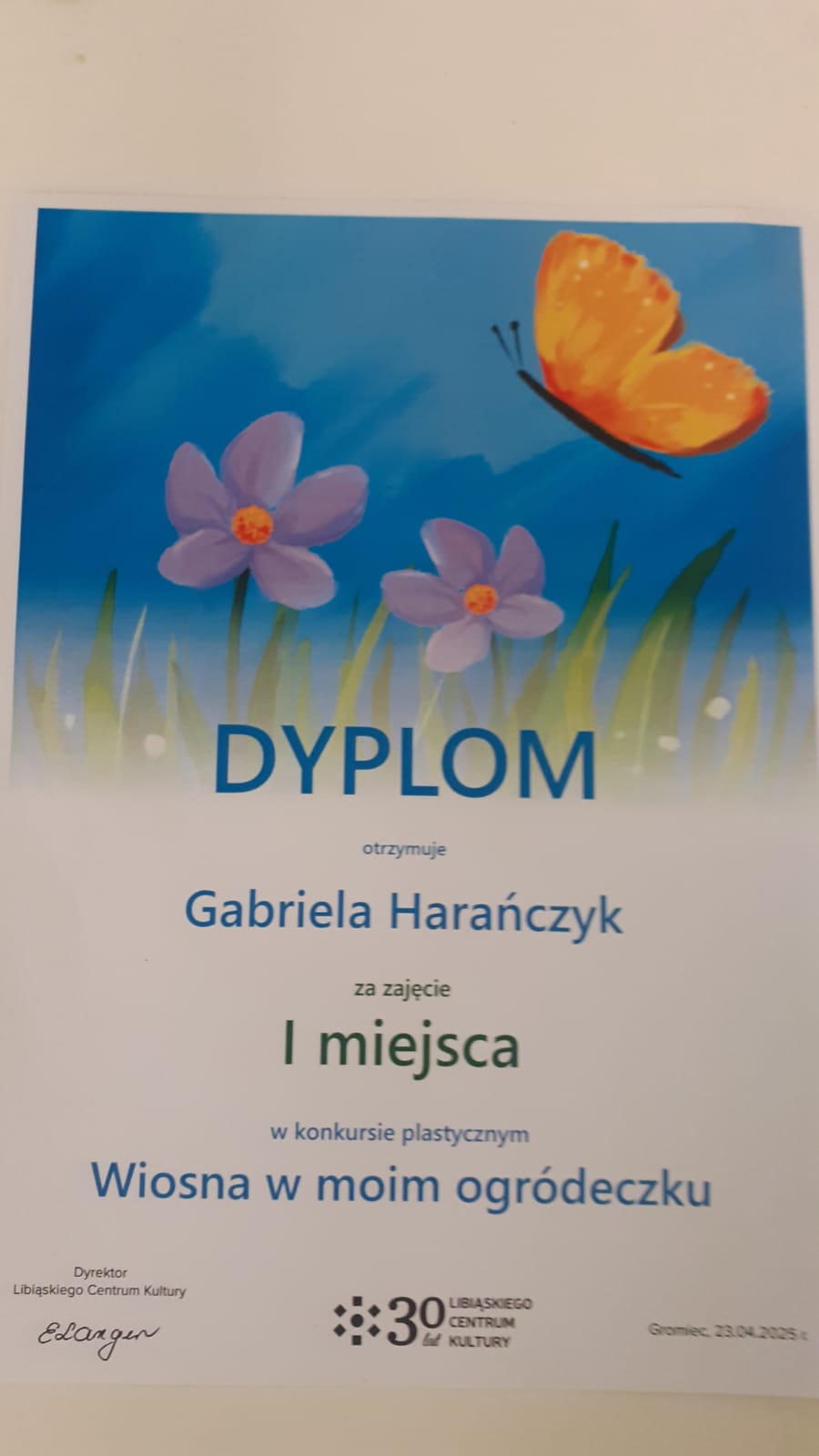 Dyplom za zajecie I miejsca w konkursie plastycznym pt “Wiosna w moim ogródeczku” organizowanym przez LCK w Libiążu otrzymała Gabrysia Harańczyk z grupy Jeżyków. Serdecznie gratulujemy!