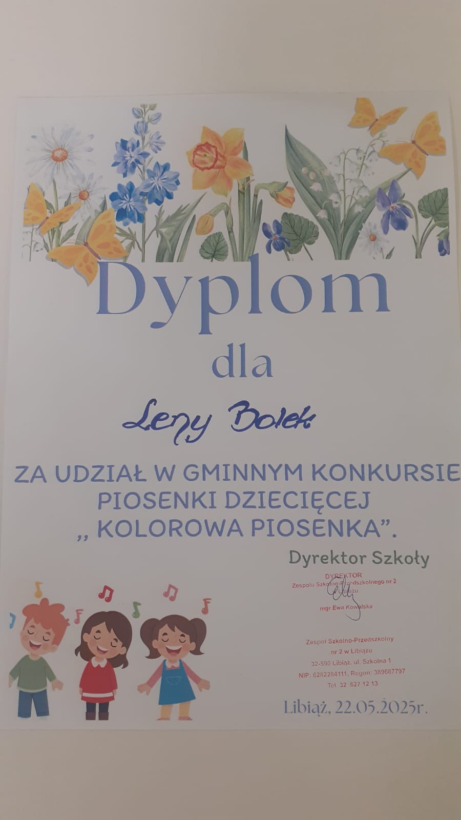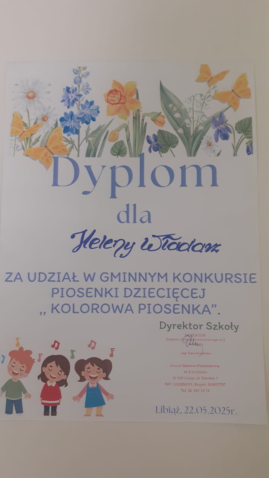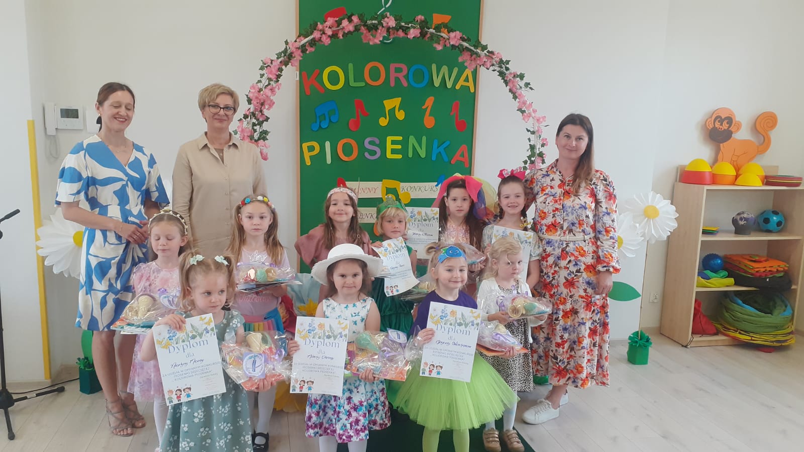 Dziewczynki z grupy Jeżyków- Helenka Władarz i Lena Bolek brały udział w Gminnym Konkursie Piosenki Dziecięcej “Kolorowa Piosenka”. Za udział wszystkie dzieci dostały dyplomy i upominki.
